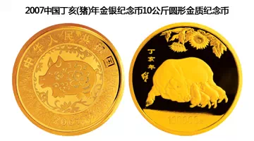 首枚10公斤生肖金币于2007丁亥猪年发行,圆形,99.9%纯金铸造,面额10万元,最大发行量18枚。