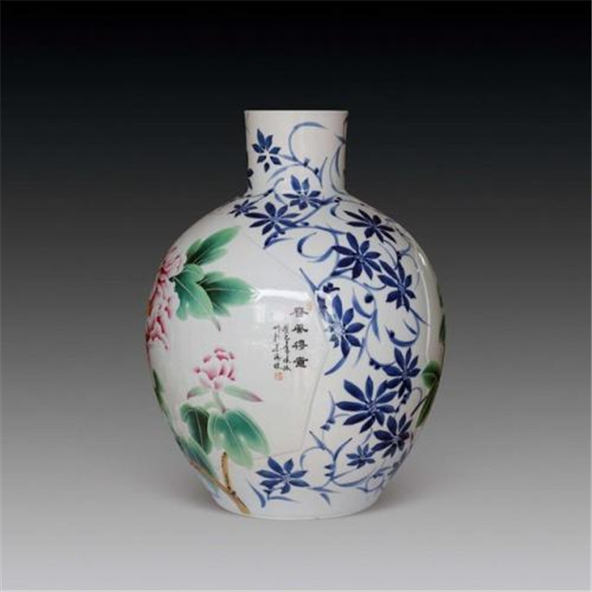 作者用春夏秋冬四景来表现方瓶的四个平面,题材与器形结合完美,画面采用粉彩工艺,使得色彩丰富而持久,体现了作者对传统工艺的传承和技艺的成熟老到。四个平面采用通景装饰手法,使得作