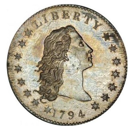 这枚名为“飘逸长发”的1794年发行的一美元银币,是当时美国首都费城铸造的首枚钱币。钱币上有披着头发的自由女神形象。这枚钱币曾为美国首任总统乔治·华盛顿所有。据悉,这是至今保存最好的1794年版一美元硬币。