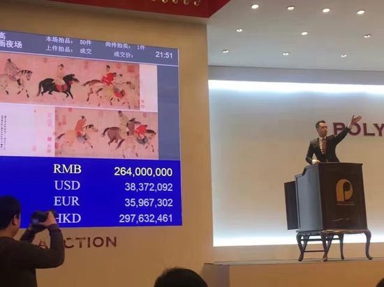 12月4日晚,北京保利2016秋拍“中国古代书画夜场”在北京四季酒店举槌,共50件精品上拍,其中,任仁发的《五王醉归图卷》以咨询价形式上拍,经过近一小时、147次的激烈竞价,最终以2.64亿元落槌,成交价3.036亿元,刷新个人作品拍卖纪录。